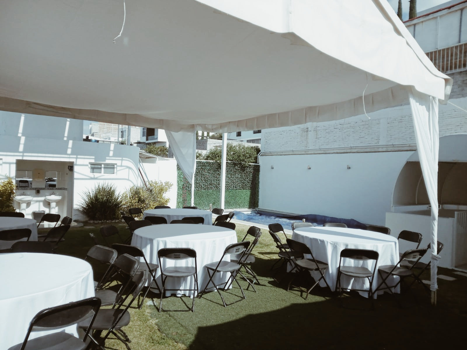 • Refrigerador, microondas, hielera grande, bocina, parrilla de gas y mobiliario (4 mesas redondas con 10 sillas cada una, manteles y tablón).